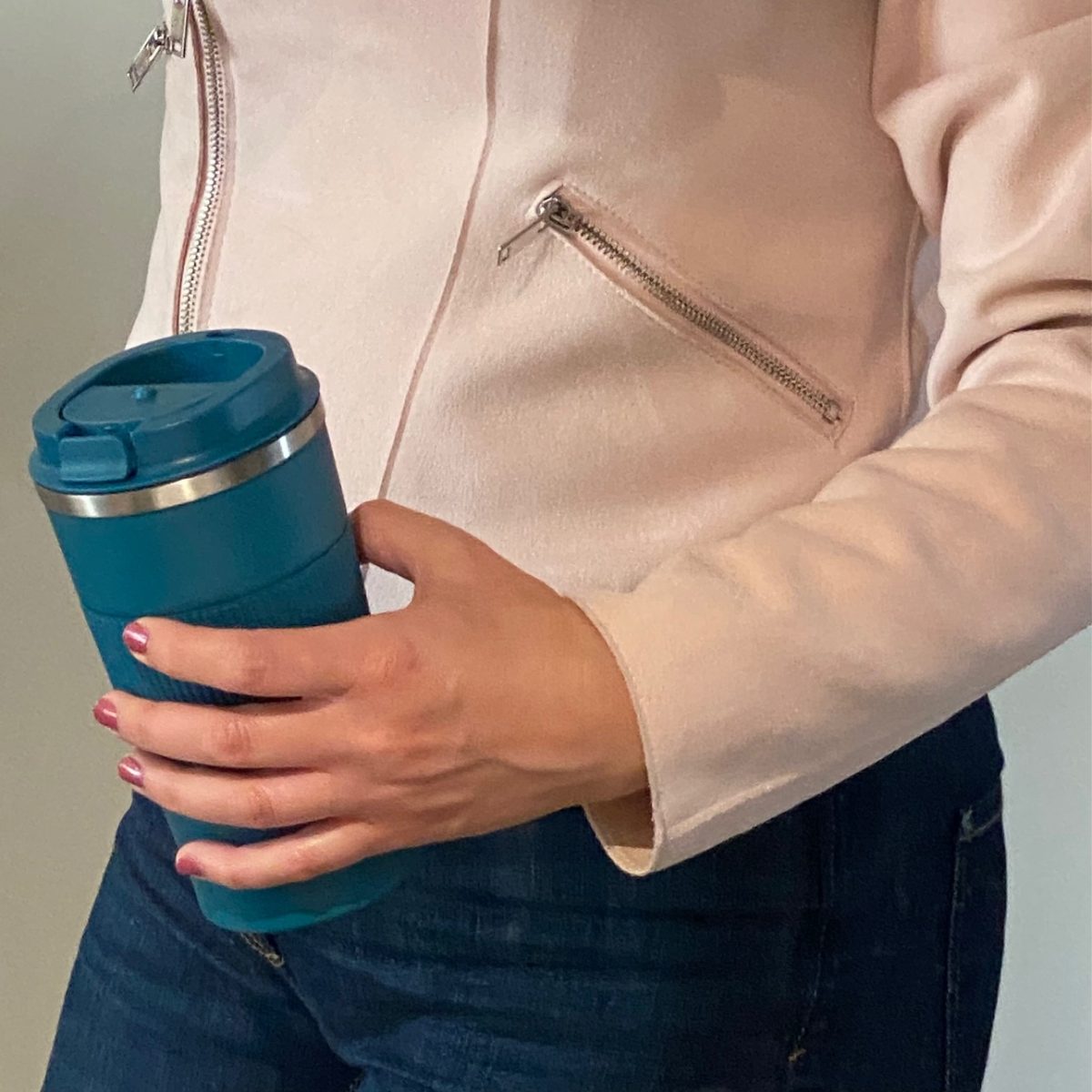 ✯ 1 db kávés utazópoharat, ami gyönyörűszép színű és formájú, rozsdamentes acélból készült és környezetbarát, rajta csúszásgátló szilikon markolat, ami a fogást könnyíti